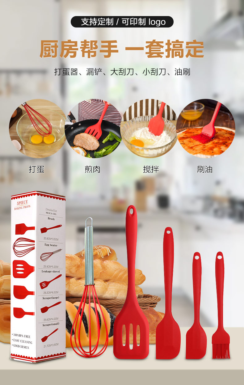 您的位置:首頁(yè) > 產(chǎn)品中心 > 硅膠廚具用品 > 硅膠廚具5件套 廠家直銷 支持定制 可印LOGO