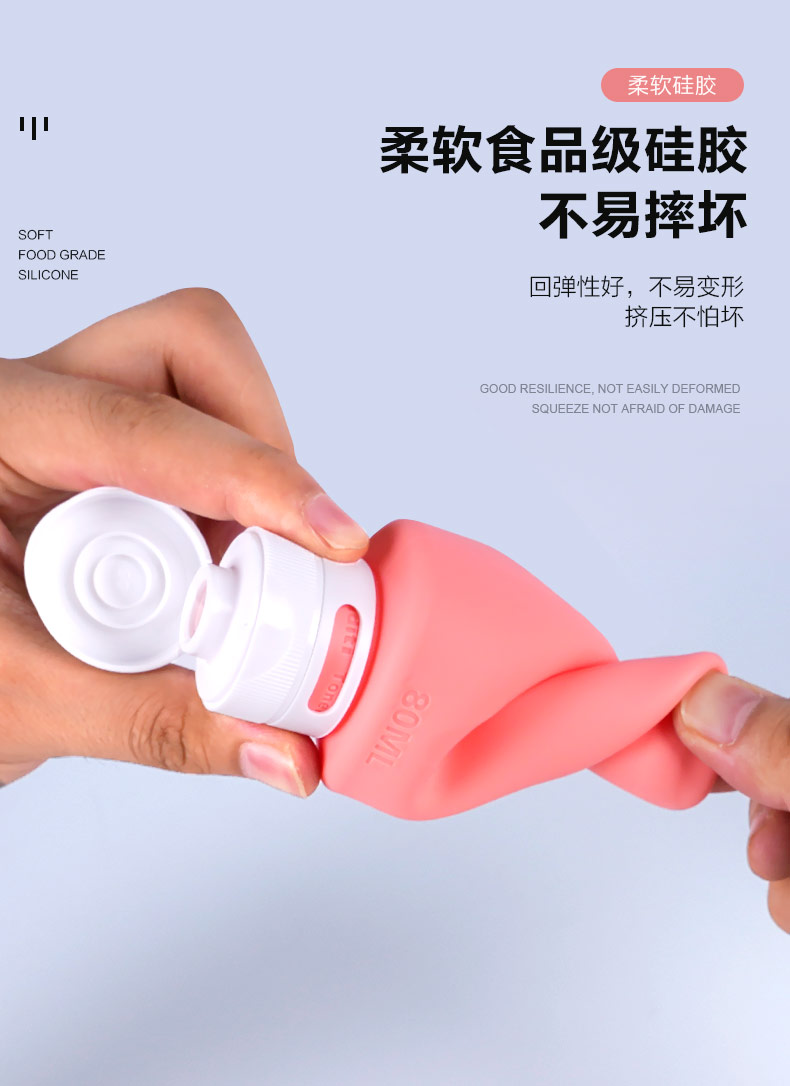 材質(zhì): 食品級(jí)硅膠瓶身+PP卡脖+PP瓶蓋