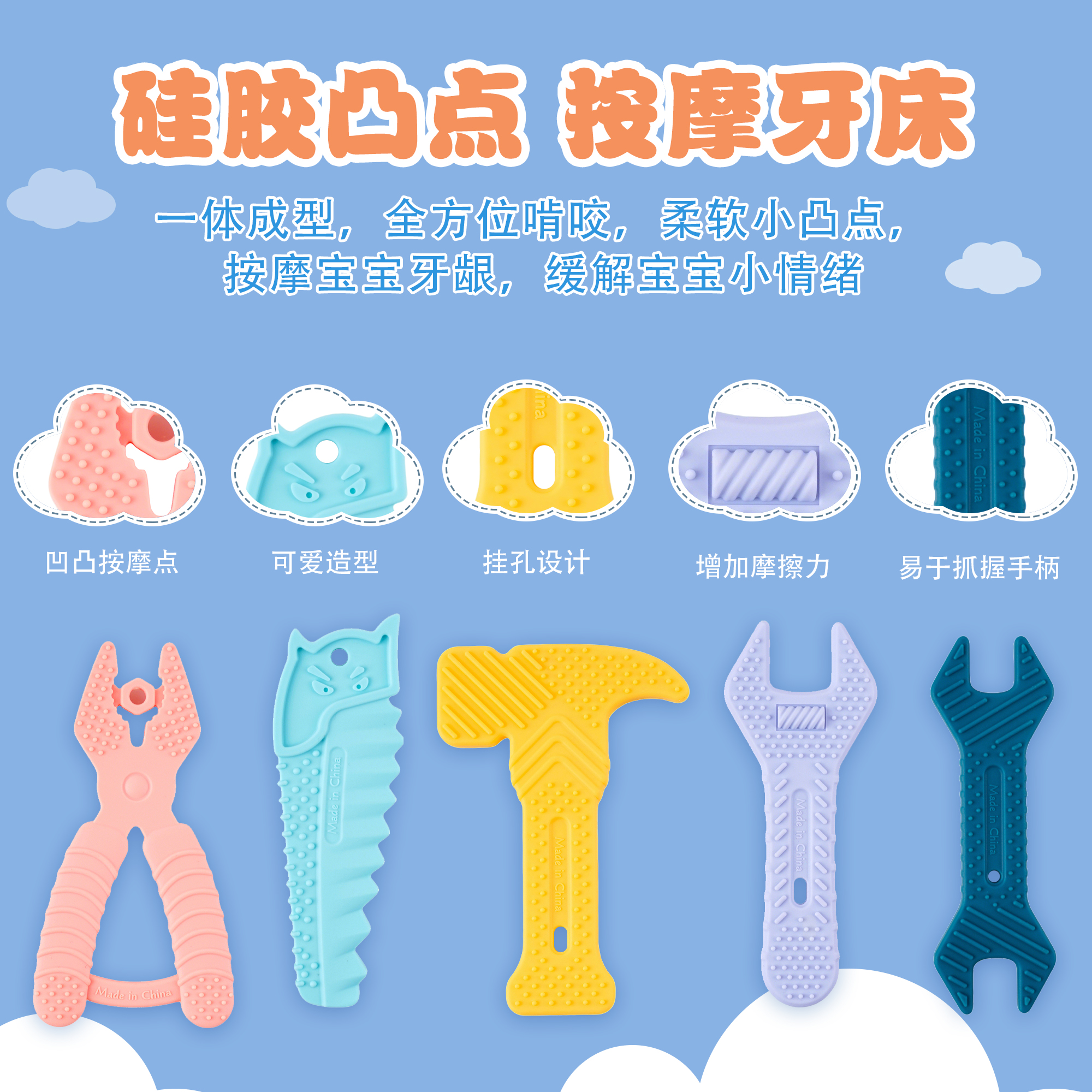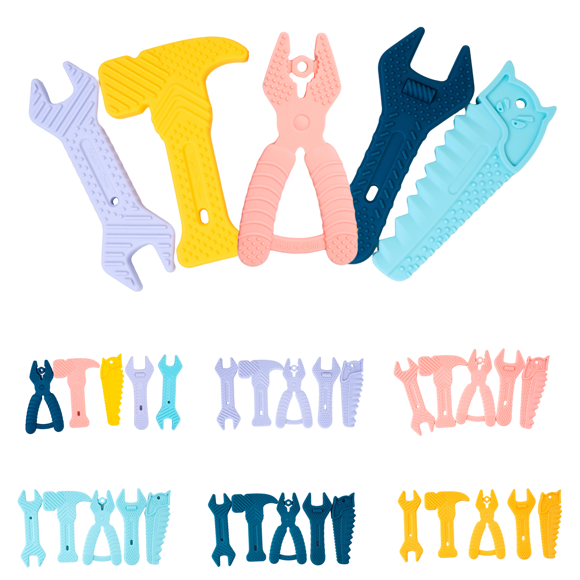 您的位置:首頁(yè) > 產(chǎn)品中心 > 硅膠嬰童用品 > 牙膠 > 亞馬遜錘子扳手牙膠嬰兒硅膠磨牙棒寶寶卡通兒童防咬手牙膠5件套